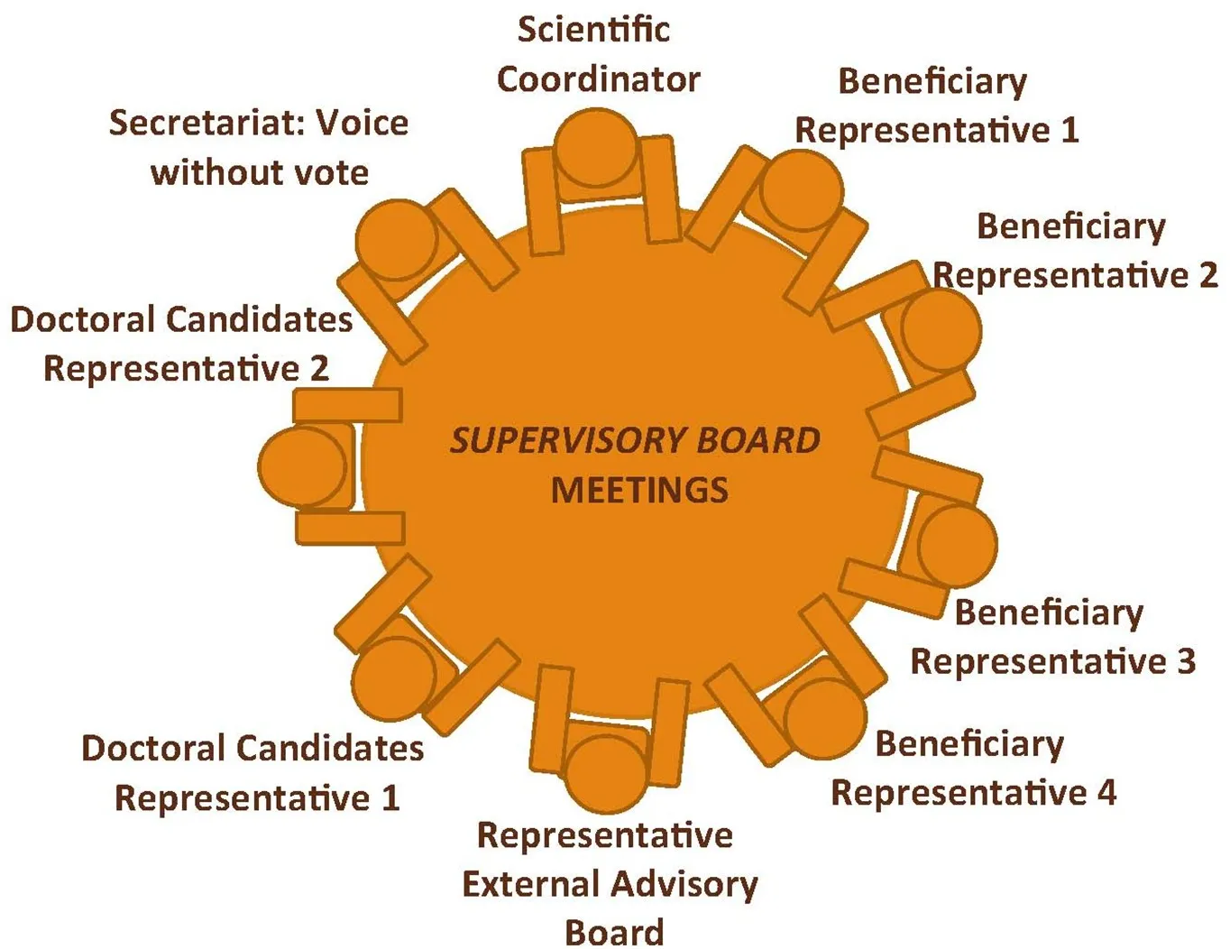 The Supervisory Board (SB) as the main decision-making body of the Consortium monitors all the Governance Structure. In particular, it coordinates and supervises the activities in line with the MSCA Guidelines on supervision https://marie-sklodowska-curie-actions.ec.europa.eu/about-msca/msca-guidelines-on-supervision, including the integration of the Doctoral Candidates in the Network, but also in their respective University, support to their research, to the training activities, in their mentoring and career development, fostering their well-being, and facilitating communication and conflict resolution.